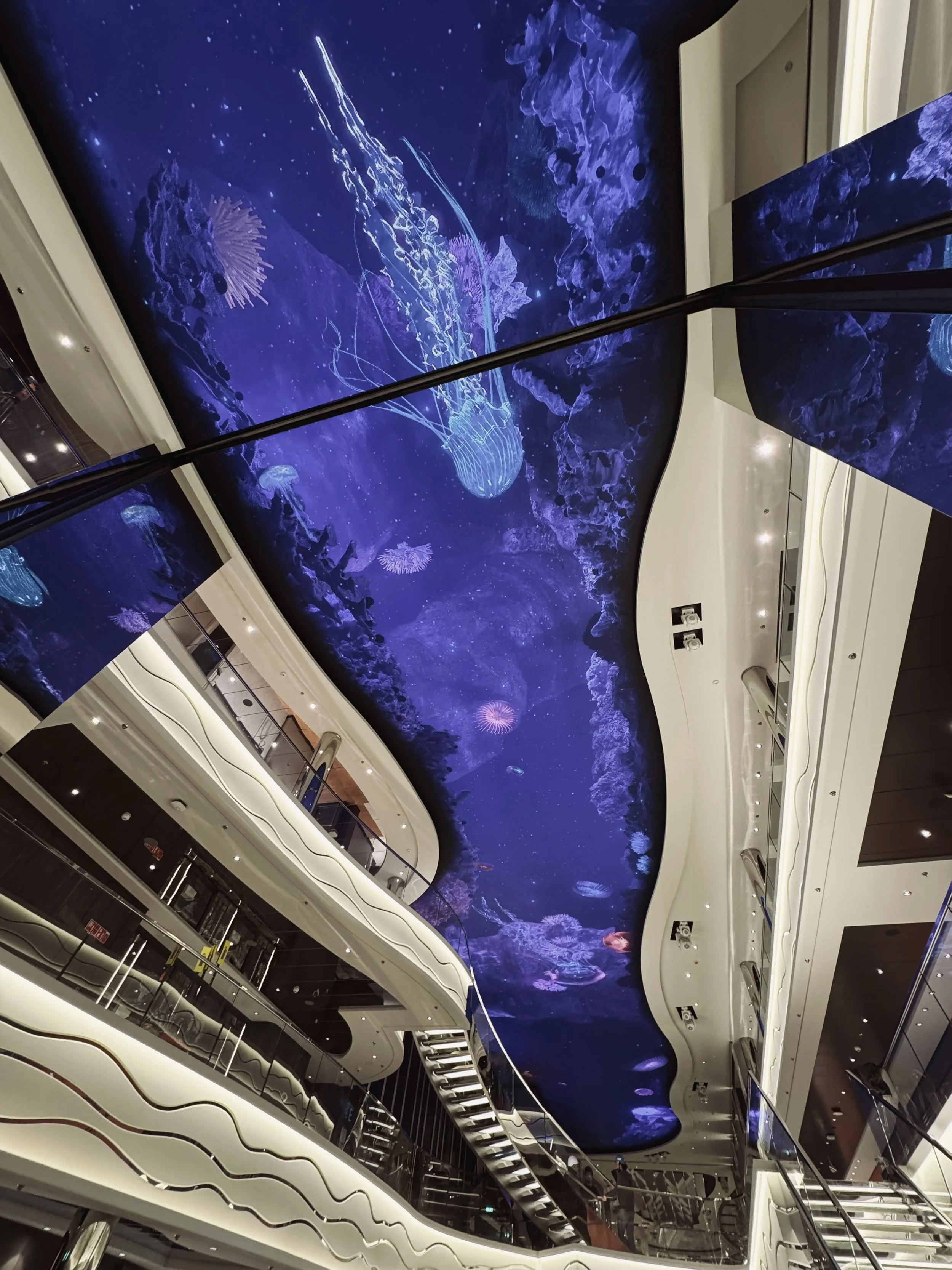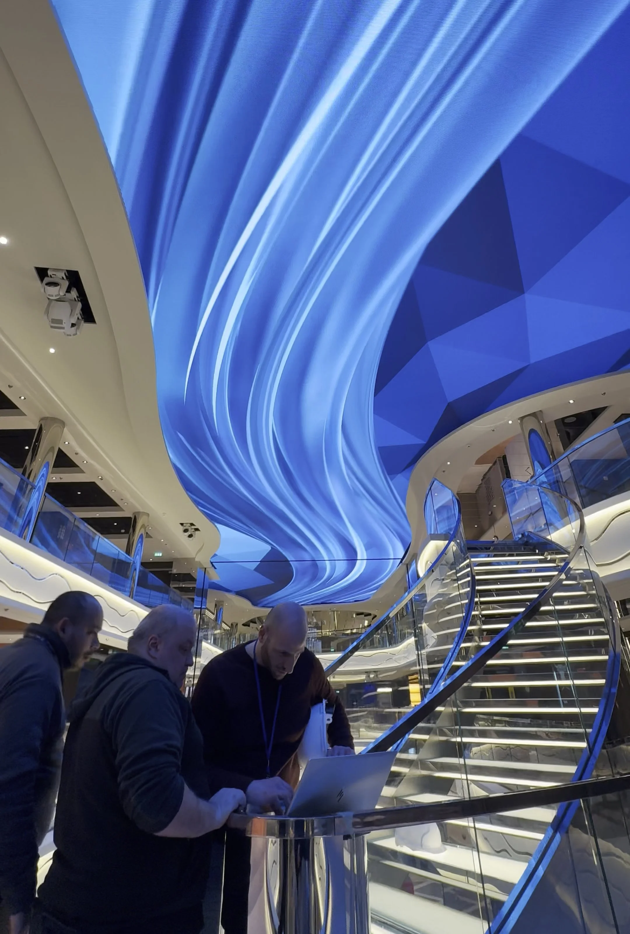 For the third consecutive ship launch, MSC Cruises partnered with Swordfish to create the content for the ship’s LED ceiling. One of the wildest parts of these engagements is the QC process, where we travel to the shipyard in Saint-Nazaire France along the Atlantic Ocean. Boarding the ship is a chaotic experience. With thousands of workers assembling this massive hotel at sea, the energy entering the yard is pure adrenaline. Once on board we have to navigate through the “I-95 Corridor”, the massive hallway running down the entire length of the ship. The bowels of the ship have the same aesthetics as a naval war ship, and the workers all behave like they are in the midst of battle. A random turn leads us to a stairwell. Walking up two flights of narrow steel stairs, we open the door to reveal a 5 star hotel with Sworavski crystal spiral staircases. The juxtaposition is truly a trip. Then we look up to see our massive 50 meter art installation… truly wild!